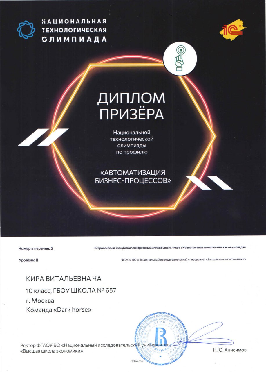 Кира Ча стала призером Национальной Технологической олимпиады по профилю "Автоматизация бизнес-процессов".